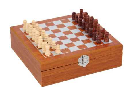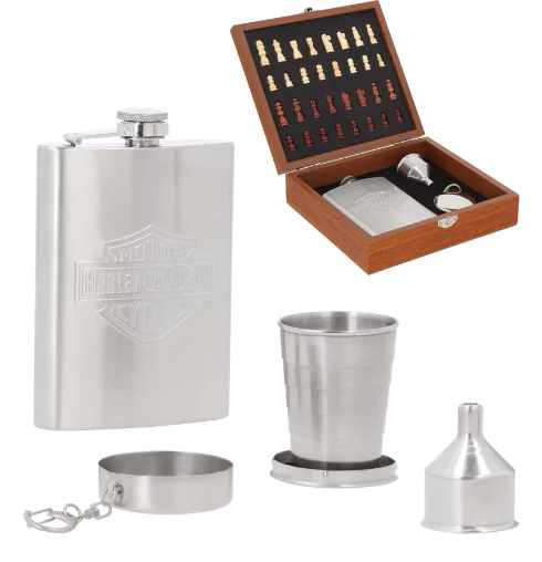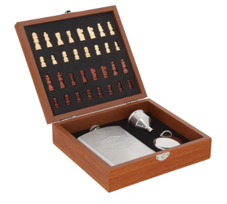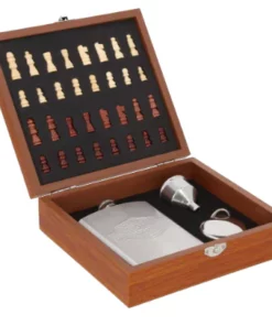 Set de licorera que incluye 1 licorera, 1 llavero que se convierte en shot, embudo y ajedrez.